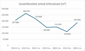 Eesti ehitusturg on kolmandas kvartalis märgatavalt elavnenud, näitavad Statistikaameti värsked andmed. Eluruumidele antud ehituslubade arv on kasvanud koguni 65% võrreldes eelmise aasta sama perioodiga (2024. aasta 3. kvartalis 113 000 m², käesoleval aastal 187 000 m²). Kasvu veab eeskätt elamuehitus, samal ajal kui büroohoonete, ladude ja muude äripindade maht on jäänud samale tasemele.